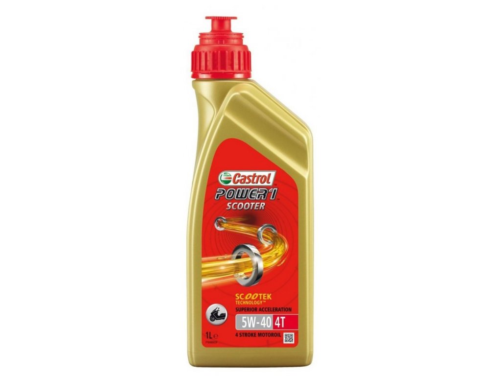 CASTROL POWER 1 SCOOTER 4T 5W-40 s technológiou Scootek je moderný olej prémiovej kvality určený pre 4-taktné motory navrhnuté špeciálne pre motory moderných skútrov. Na rozdiel od konvenčných 4T motocyklov s integrovanou spojkou a prevodovkou, 4T skútre využívajú remeňom poháňanú bez stupňovú CVT prevodovku. Motory skútrov sú tak často kompaktnejšie, zasadené v karosérii a častejšie pracujúce na plný plyn. Dôsledkom toho je, že tieto motory pracujú pri vyšších teplotách ako motory konvenčných 4T motocyklov.Castrol Power 1 Scooter redukuje vnútorné straty v motore a napomáha zvládať zaťaženie pri vysokých teplotách.