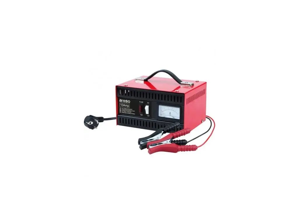 Kvalitná autonabíjačka od renomovanej nemeckej značky Aroso s tradíciou už od roku 1973 na západoeurópskych trhoch v celokovovom vysoko odolnom prevedení pre profesionálne použitie v dielni aj v domácnosti, pre autobatérie 6V (pre motocykle) alebo 12V (pre automobily) s kapacitou 25-105Ah. Istenie nožovou poistkou 15A. Nabíjací prúd až 10A. Rýchlosť nabíjania plne vybitého akumulátora 30Ah cca 8-9h, akumulátor 80Ah cca 12-14h. Nabíjačka je určená pre kyselino-olovené akumulátory. Veľmi bezpečná konštrukcia odolná proti mechanickému poškodeniu. Stupeň krytia IP20. Odolné madlo na vrchnej strane pre ľahké prenášanie.